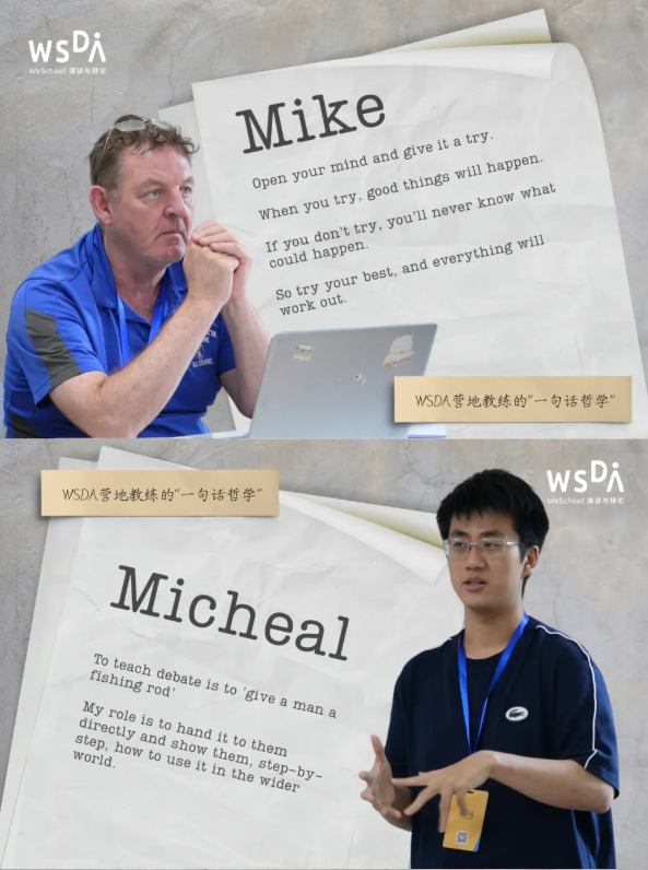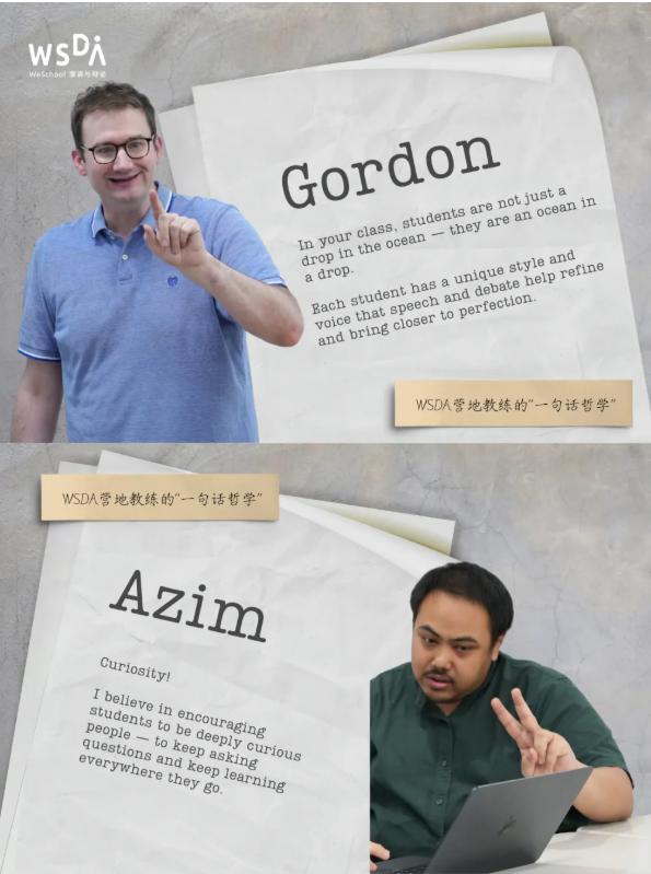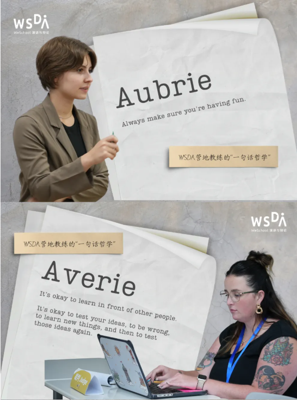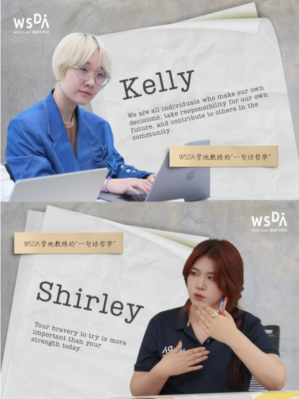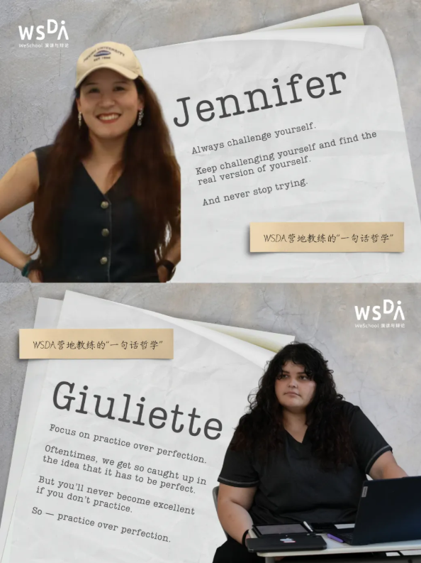 在暑假的WSDA夏季综合学术营里,教练和孩子们共同创造了无数闪光的成长瞬间:在辩论中训练批判性思维,在演讲中探索世界议题、在英文戏剧排演中看到人生的多种可能……而孩子们的成长,也折射出教练们对教育的理解——如果用“一句话”概括自己的教育理念,11位教练给出了11种答案:好奇、勇气、用心、行动、做自己……