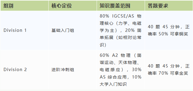 SPC 由英国物理学会主办,主打 “入门友好”,不按年级或课程体系分组,所有参赛者统一命题、统一排名,仅通过成绩划分奖项,对低年级学生更包容。