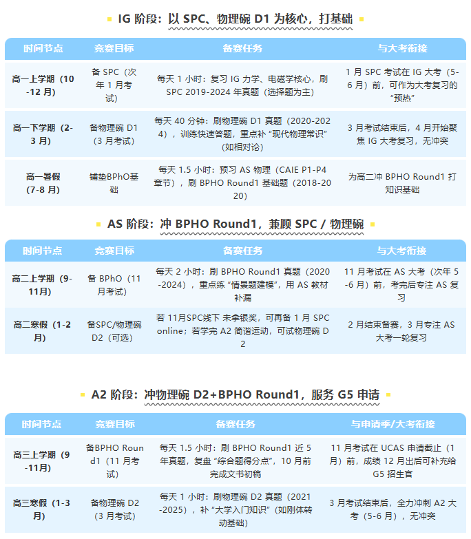 · A2 阶段(高三):BPHO Round1(11 月,冲金奖)+ 物理碗 D2(次年 3 月,补奖项),聚焦 G5 申请核心需求。