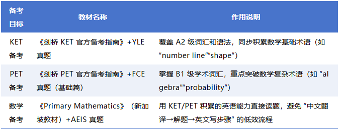 每天 1.5 小时 KET/PET(背词汇 + 练阅读,优先积累数学相关词汇,如 “measurement”“data”),1 小时数学(啃新加坡教材,用英文标注术语含义,建立 “术语 - 中文 - 公式” 关联);