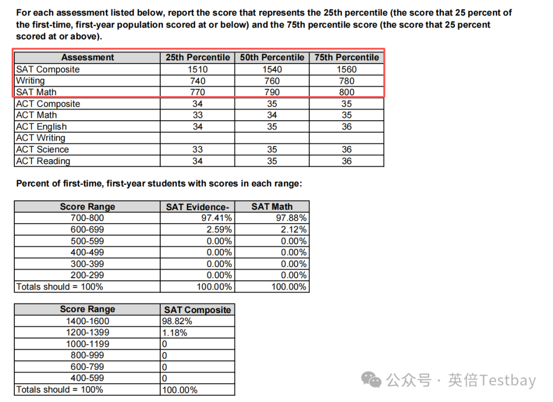 在提交SAT的学生中,25%、50%和75%百分位分别对应的成绩是1510、1540和1560。其中,阅读语法部分中位是760,数学部分中位是790,75%百分位已经是满分800。
