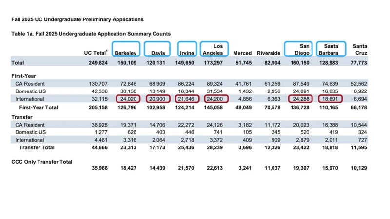 近年来,加州系大学凭借整体排名稳步攀升、学费性价比高、标化成绩可选提交、毗邻高新科技产业区以及西海岸阳光沙滩的宜居气候等多元优势,持续吸引着全球申请者的目光。以2025申请季为例,尽管加州大学体系整体申请者数量较上一周期微降0.5%,但国际生申请人数却逆势增长了2,567人,也客观展现国际生源圈层在加州大学申请中竞争愈发白热化。