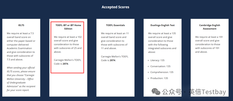 托福总分至少100分。对单项要求:阅读26分,听力26分、写作22分、口语25分。