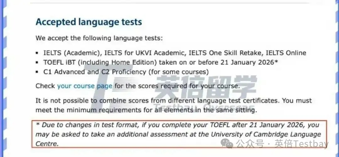近日,剑桥大学研究生院再次更新官网入学语言测试要求:在2026年1月21日后参加托福考试的学生, 除了提交新托福成绩外, 可能还要参加剑桥大学语言中心的额外评估。