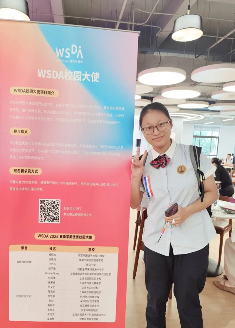 正是怀揣着对于辩论活动的热爱,Katherine主动申请成为WSDA校园大使,并被评选为2025 WSDA最佳校园大使。谈及申请的初衷,她坦言道:“一方面,我热爱辩论,希望能把自己的辩论经历分享给更多热爱表达的同学,为他们提供力所能及的帮助。另一方面,我非常喜欢并深深感激WSDA这个平台,它不仅给我们提供了一个展示自我的舞台,更让我有机会结实到许多志同道合的伙伴,收获巨大的成长。”为此,她渴望成为WSDA大家庭中的一员,把自己摸索出来的辩论经验传递给更多人,激发每一位有兴趣的同学发掘自身的潜能,享受辩论和演讲带来的乐趣。