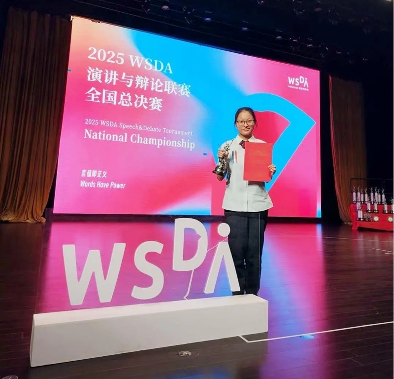 这些历练,让Katherine明确了自己对于辩论的热爱,也让她渴望在一个更纯粹的辩论舞台上发挥自己的潜能。恰逢此时,WSDA的即兴辩论赛事走进了她的视野,这仿佛是一个为她量身打造的平台。很快,在2025春季北京区域赛中,Katherine获得中学组即兴辩论冠军,并在几个月后的全国总决赛上再度登顶。“不鸣则已,一鸣惊人”,经历漫长的蛰伏期后,Katherine的天赋和热爱终于迎来了酣畅淋漓的绽放。