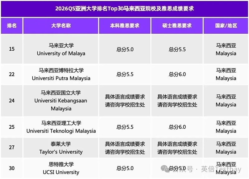 QSTop500的马来西亚高校100%认可雅思。马来西亚一些大学的部分本科或研究生项目甚至明确表示——只接受雅思作为唯一语言申请材料,不接受其他语言考试成绩。只需雅思5.0分,就有机会直录QS百强名校!