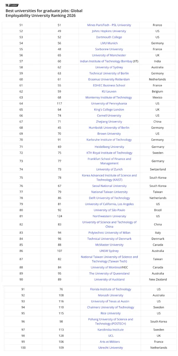 该排名通过收集32个国家和地区中12,350家雇主的119,967份评估数据,最终遴选出全球250所毕业生就业竞争力最强的学府。