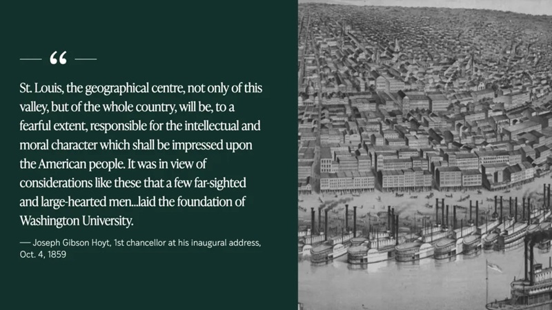 圣路易斯华盛顿大学创立于1853年,由十七位圣路易斯商业、政治和宗教领袖组成的校董会发起,核心人物包括参议员克劳和牧师艾略特(诗人T.S.艾略特的祖父),校名初为艾略特神学院,后因牧师反对改为华盛顿学院,最终于1856年定名华盛顿大学,以彰显维护国家统一的愿景。