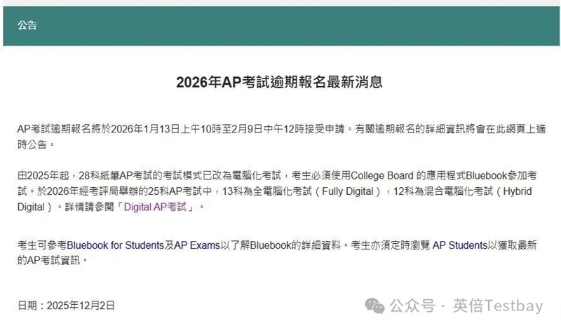 2026AP考试第二轮报名已正式启动,这是锁定考位的最后末班车!无论你是错过首轮报名的同学,还是想补充报考科目,都别再错过这次关键机会——中国香港、新加坡、韩国等亚太核心考区均有二轮报名通道,部分考区截止时间延伸至2026年3月,但热门科目考位紧张、先到先得。本次报名不仅覆盖常规考试科目,还包含需提交作品集的AP艺术设计类、AP学术论文等特殊科目,同时明确了机考设备要求、报名资格审核及重复报考禁忌等关键规则。为帮大家顺利完成报名,下文为大家整合各考区报名时间及流程。