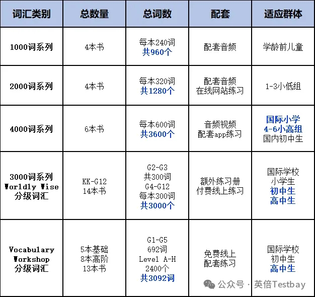 上图总结了不同阶段孩子可以学习的词汇书和词汇量,我们会发现: