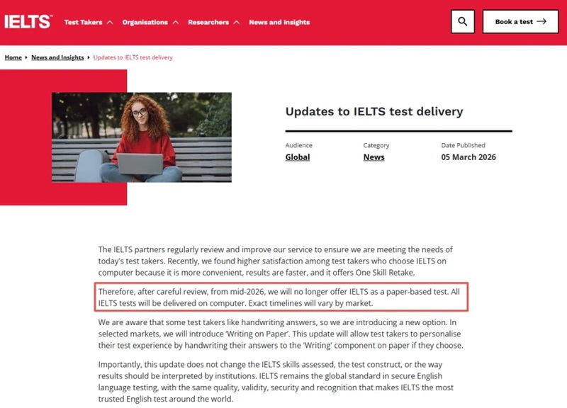 “留学圈炸锅了!2026年3月5日,雅思官方正式发布重磅公告:自2026年年中起,将全面取消雅思纸笔考试,所有雅思考试将统一转为机考形式,具体实施时间将根据不同市场略有差异,其中用于英国签证及移民的UKVI考试将率先取消纸笔形式,大陆地区最后一批纸笔考位已同步释放,截止6月28日后,将彻底告别纸笔雅思时代。”