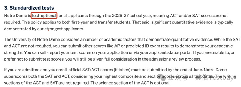 圣母大学还提到,假如学生不提供SAT/ACT成绩,AP/IB大考成绩也是一个彰显学术背景的选择。