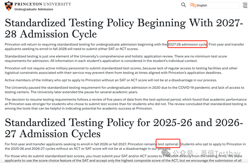 普林斯顿大学官宣,2027Fall将继续标化可选的标化政策,但是2028Fall开始将恢复递交标化的要求。