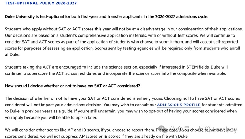杜克大学宣布,2027Fall将继续采取标化可选政策。此外,杜克还提到鼓励参加ACT的学生参加 science section的考试,尤其是申请STEM专业的学生。