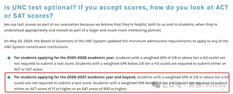 北卡2027Fall要求学生递交标化成绩,但是满足以下条件的同学可以豁免: