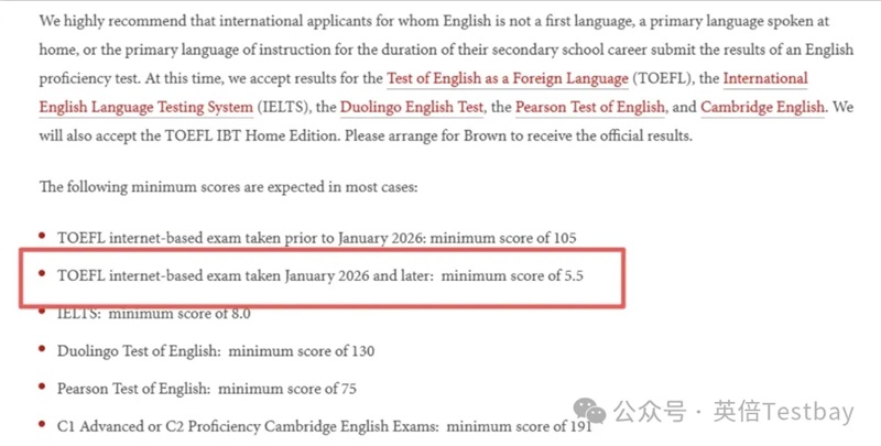 布朗大学原来要求托福105+,新托福是5.5+,对应120分制也是107+,难度也有所提升。