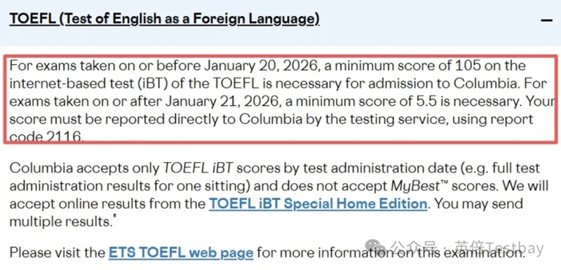 哥伦比亚大学作为常春藤联盟的成员,U.S.News全美大学排名第15位,对语言成绩的要求一直处于较高水平。哥伦比亚大学新托福要求最低 5.5 分,不接受 MyBest 拼分,但认可托福家考。哥大原来要求托福105+,现在要求5.5+,换算成新托福标准是107+,相当于提高了门槛。