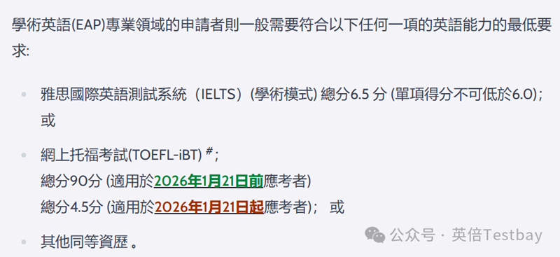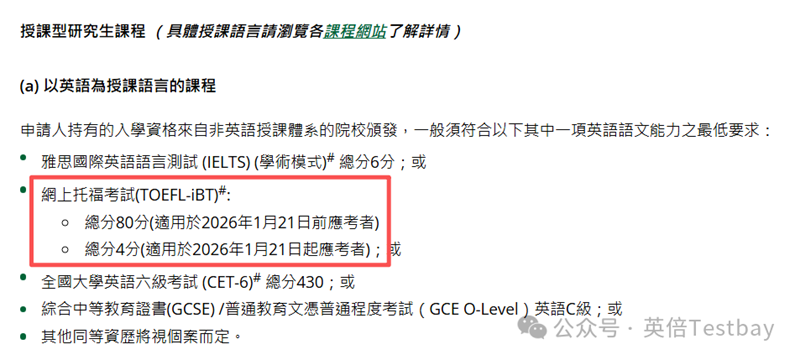 港教大研究生课程的录取要求页面已经更新了新托福的录取要求,以2026年1月21日为分水岭,实行了两套分数标准: