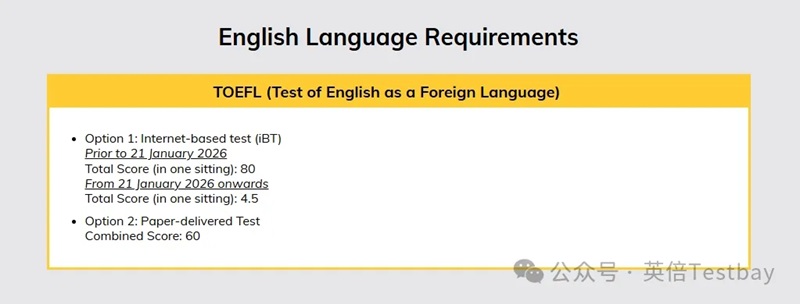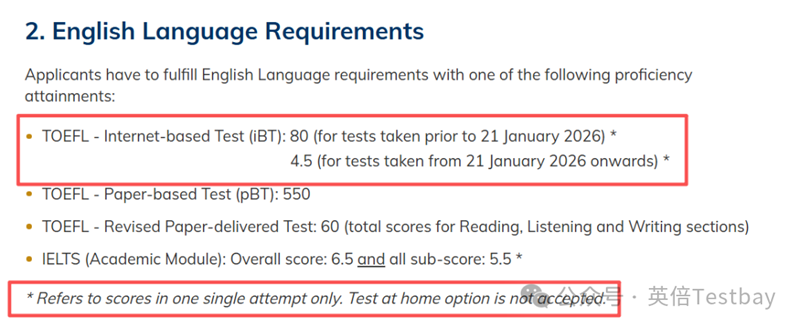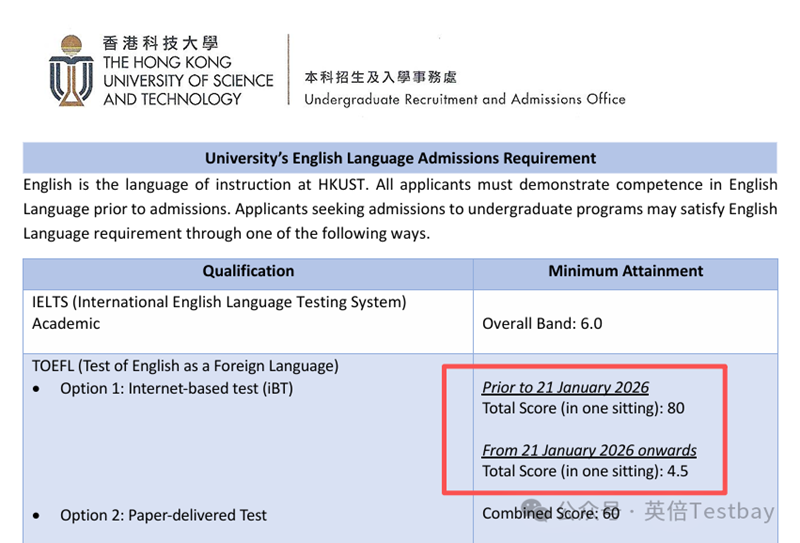 港科大的本科和研究生都已经进行更新。研究生:港科大研究生招生要求页已经明确写明,TOEFL iBT为80(2026/1/21前)或4.5(2026/1/21起);同时注明at-home版本不接受。也不接受拼分。