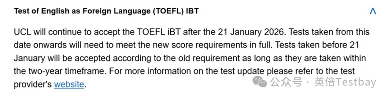 自2026年1月21日起,新版托福iBT成绩将被纳入语言能力认证范围。与此同时对在此日期前取得的原有托福成绩仍维持之前的认可标准。UCL接受托福家考成绩,但不接受托福MyBest Score(拼分成绩)和托福Essentials考试;不接受多邻国成绩;也不接受雅思拼分,即使雅思小分只差0.5分,也需重考。