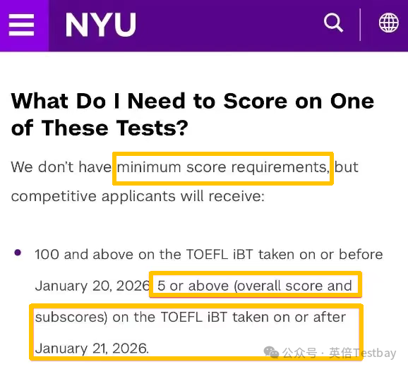 2026年1月20日及以前参加的托福考试,要求总分最低为105分