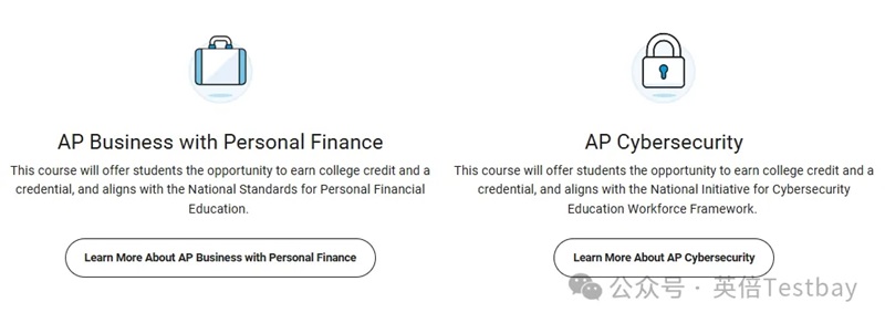 2026 年AP新增的两门职业导向型课程:AP Business with Personal Finance(商业与个人理财)和 AP Cybersecurity(网络安全)。这两门课程均属于 AP Career Kickstart 系列,计划于今年秋季全球推出,2027年5月首次进行AP考试。