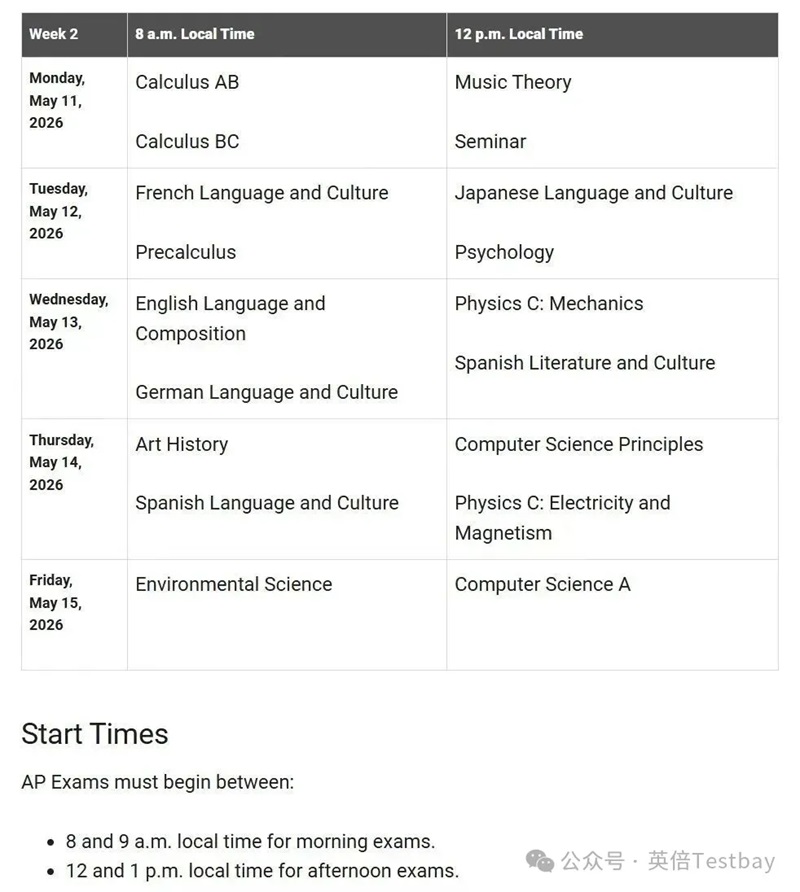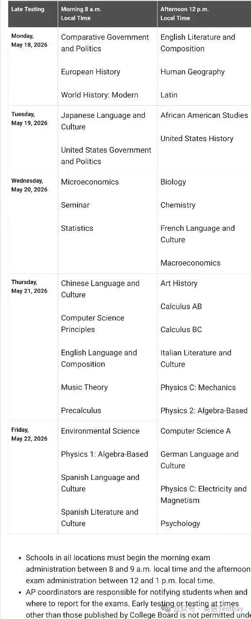 2026年AP考试将于2026年5月4日~8日和5月11日~15日两周内进行。