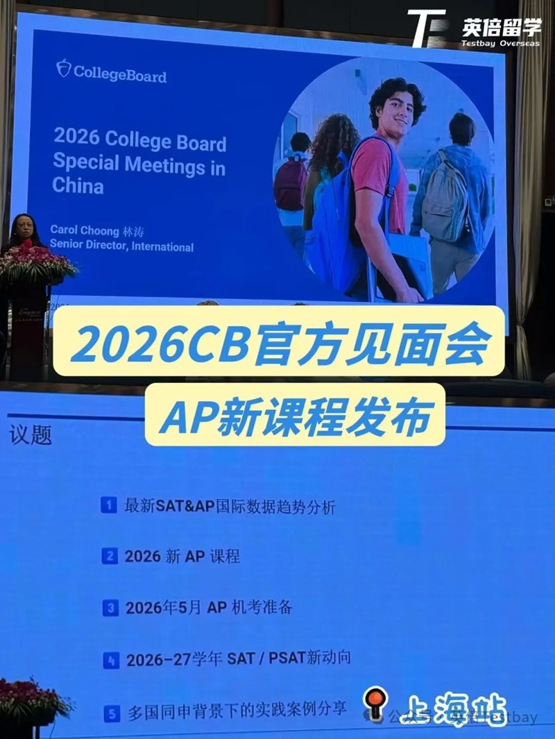 近日,CB官方在上海举办2026特别见面会暨AP新课程发布会。这场见面会释放了两个信号,AP体系首次向职业能力延伸,介绍了即将上线的两门全新AP课程,给出了AP学习建议,让低年级学生有了更友好的入门路径。同时,还发布了2025年AP和SAT最新的全球及中国数据。AP考试突破10万科次、SAT考生增长50%、成绩流向全球30多个国家和地区,多国联申已成为不可逆的趋势。接下来一起看看都有哪些新趋势~