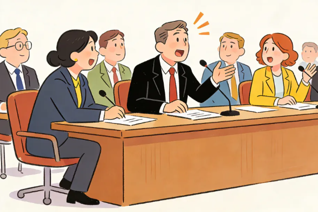 一群政策代表围坐在一张长会议桌旁。
