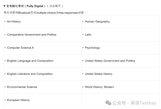 自2025年起,28科纸笔AP考试的考试模式已改为电脑化考试,考生必须使用College Board的应用程序Bluebook参加考试。