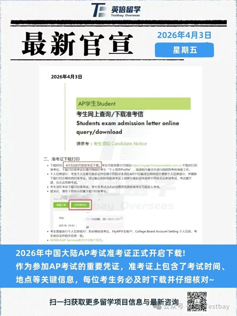 2026年中国大陆AP考试准考证正式开启下载!作为参加AP考试的重要凭证,准考证上包含了考试时间地点等关键信息,每位考生务必及时下载并仔细核对~