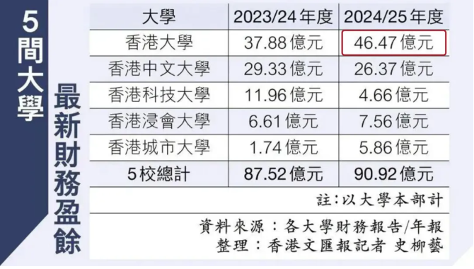 事实上,港媒最新披露的香港五所高校财务盈余数据显示,港大以46.47亿港元位居榜首,且盈余规模占五校总盈余的一半以上。不过,学校的储备资金大多有指定用途,或属于需长期规划使用的发展基金,无法随意调用。而教资会拨款、社会捐赠、研究基金等传统融资渠道,又存在较强的被动性与不确定性。